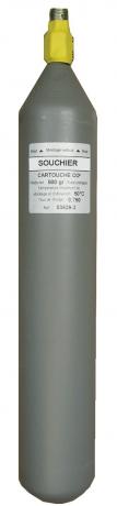 Cartouche métallique de coloris gris, équipée d'une tête écrou 15/125 et d'un opercule, chargée de CO2 en phase liquide et gazeuse à usage unique.