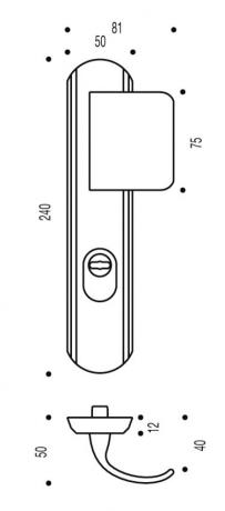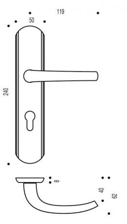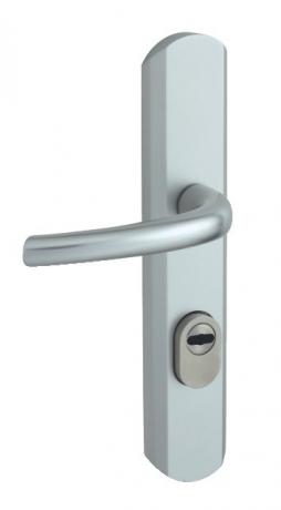 Ensemble complet plaques et béquilles solidarisées. Serrure entraxe à 70 mm.