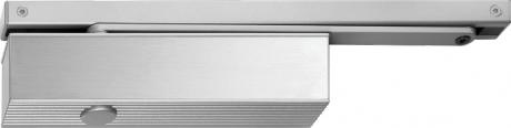Ferme-porte à crémaillère elliptique avec bras à coulisse. Réversible droite et gauche. Freinage à l'ouverture, à-coup final et vitesse de fermeture réglables en continu.