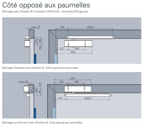Montage sur vantail côté paumelles et opposé sur huisserie.