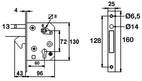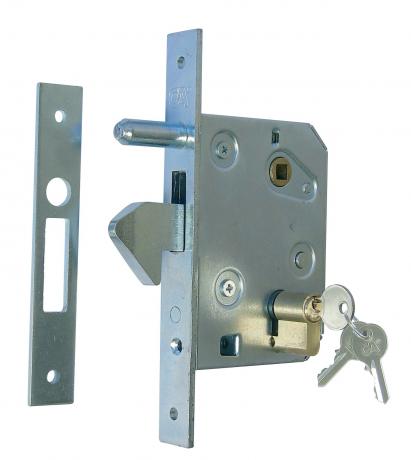 Serrure à crochet avec gâche et doigt anti-soulèvement. Axe 60 mm.