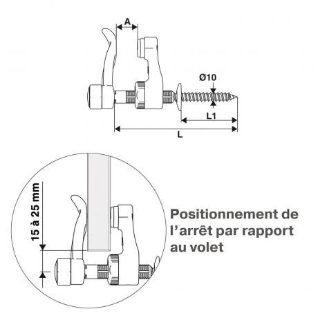 Avec butée amortisseur en caoutchouc qui préserve le volet. Vis : Ø 10 x 70 mm.