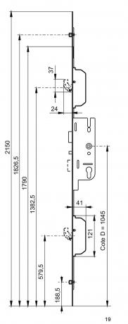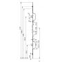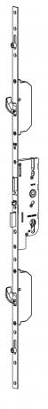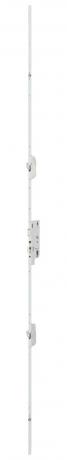 Serrure à têtière filante, verrouillage central pêne 1/2 tour et pêne dormant (2 crochets et 2 galets). Condamnation par clé.