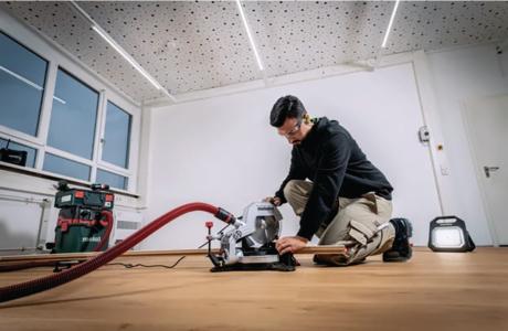 Livrée avec 1 lame de scie carbure (60 dents), 2 rallonges latérales de table, 1 butée de tronçonnage, 1 pince de serrage, 1 outil pour le changement de la lame, 1 enrouleur de câble et 1 sac collecteur de sciures.